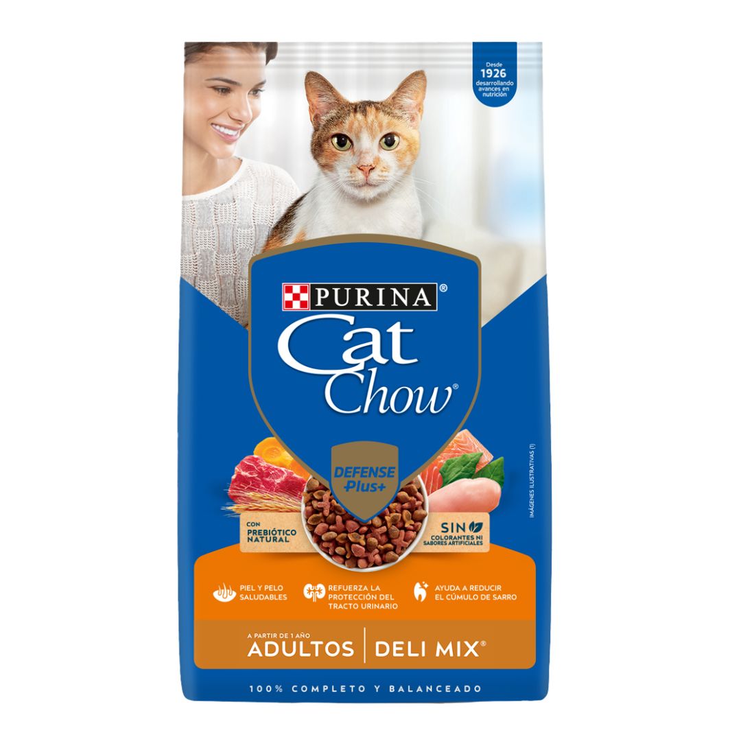 Alimento para gatos Adultos de todos los tamaños CAT CHOW® Delimix Defense Plus. Delicioso mix de salmón, carne y pollo. Ayuda a reducir el cúmulo de sarro. Con prebiótico natural. Sin colorantes ni sabores artificiales. 100% completo y balanceado.