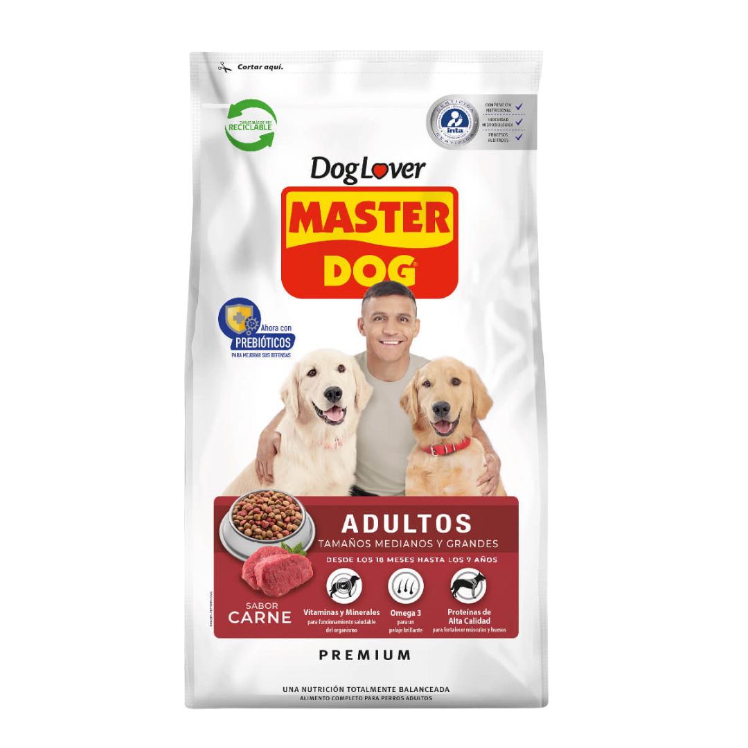 Alimento completo y balanceado recomendado para tu Master Dog Adulto Razas Medianas y Grandes, desde los 18 meses hasta los 7 años. Contiene Omega 3 para una piel sana y pelaje brillante. Además contiene proteínas de alta calidad, vitaminas y minerales que tu Master Dog necesita para mantenerse fuerte y saludable.